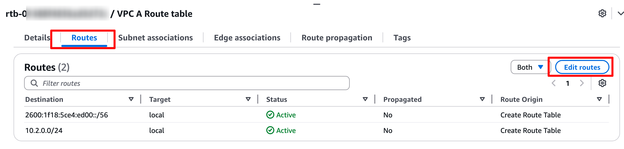 选中 VPC A Route Table 的复选框,向下滚动选择 Routes 选项卡,然后点击 Edit routes