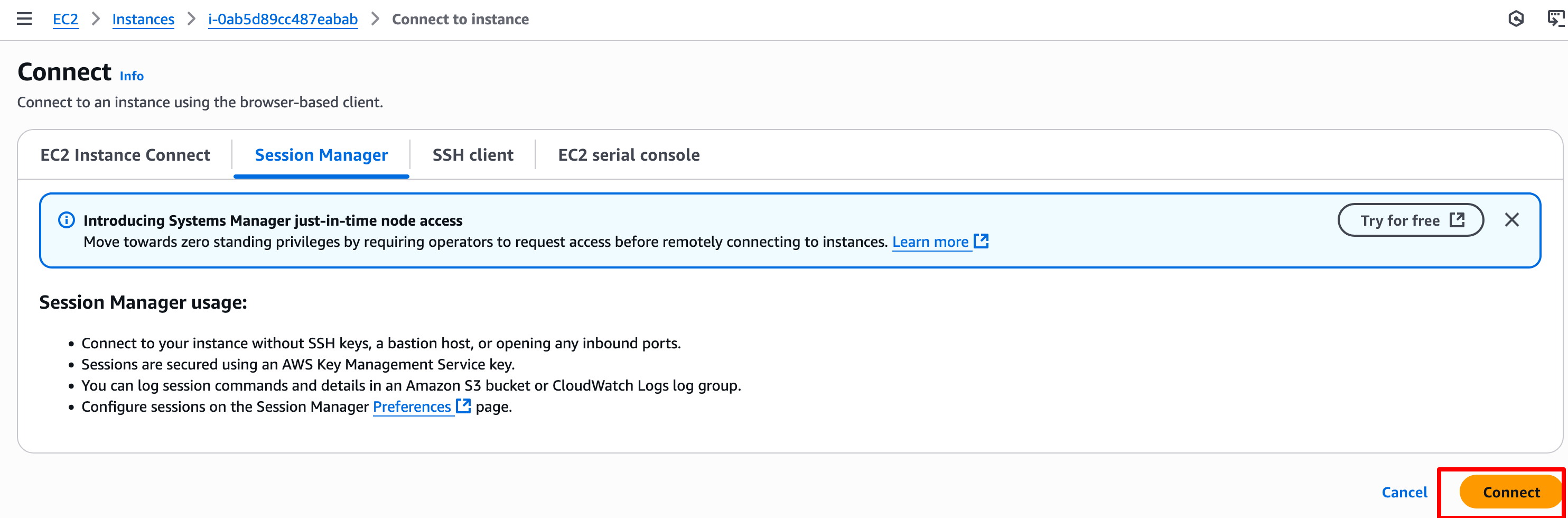 在连接到实例页面中,选择 Session Manager 选项卡,然后点击 Connect 按钮。