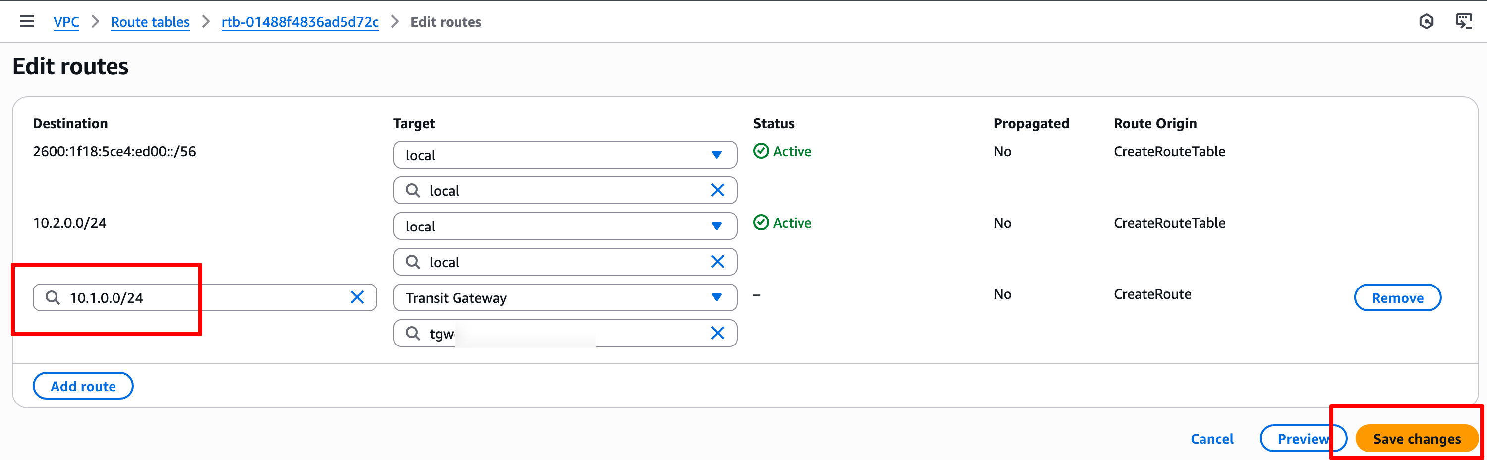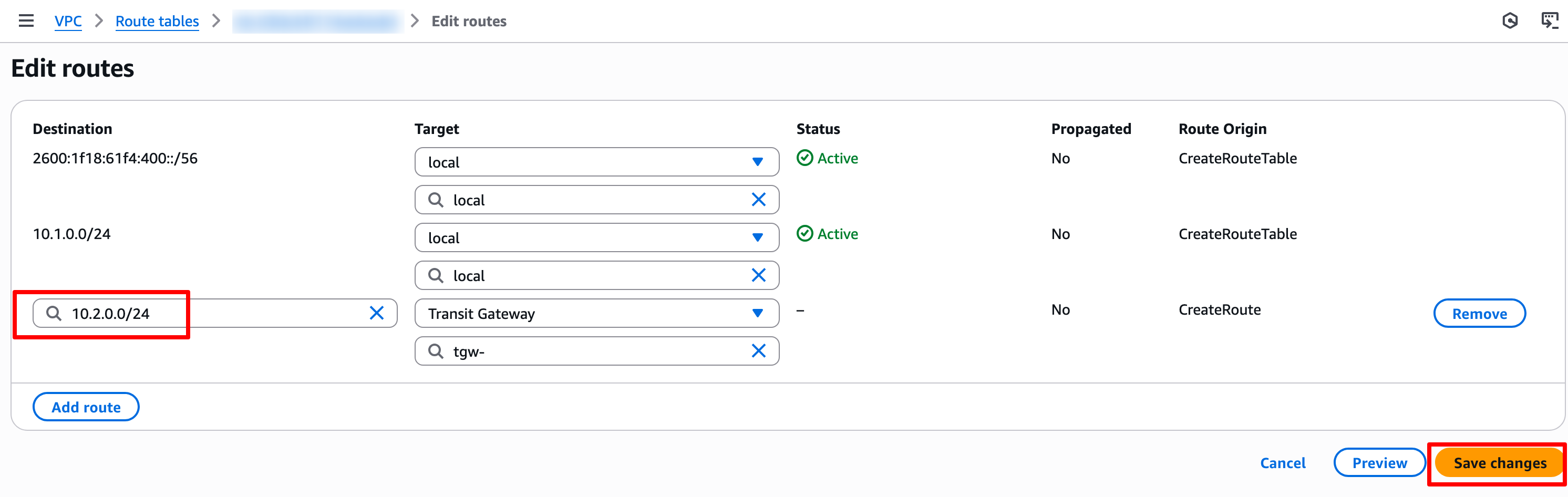 在VPC A私有路由表中添加一条到Central VPC的路由,目标地址为 10.1.0.0/24,Target为transit gateway(TGW VPC A attachment)。点击 Save routes