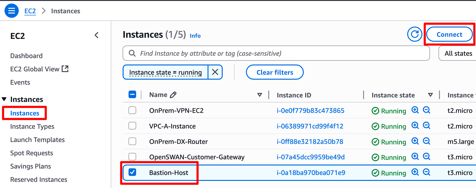 打开 EC2 Console,然后从侧边菜单中选择 Instances。点击 Bastion-Host 实例,然后点击 Connect 按钮。