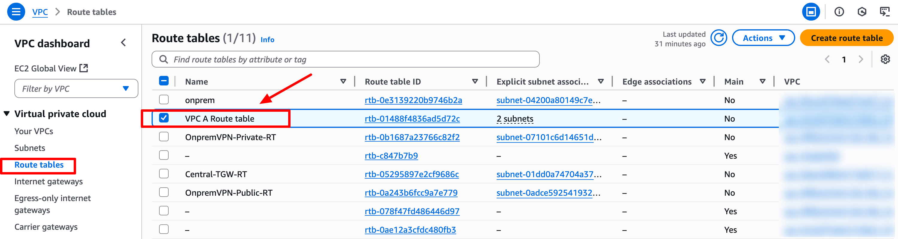 在VPC控制面板左侧点击 Route Tables
