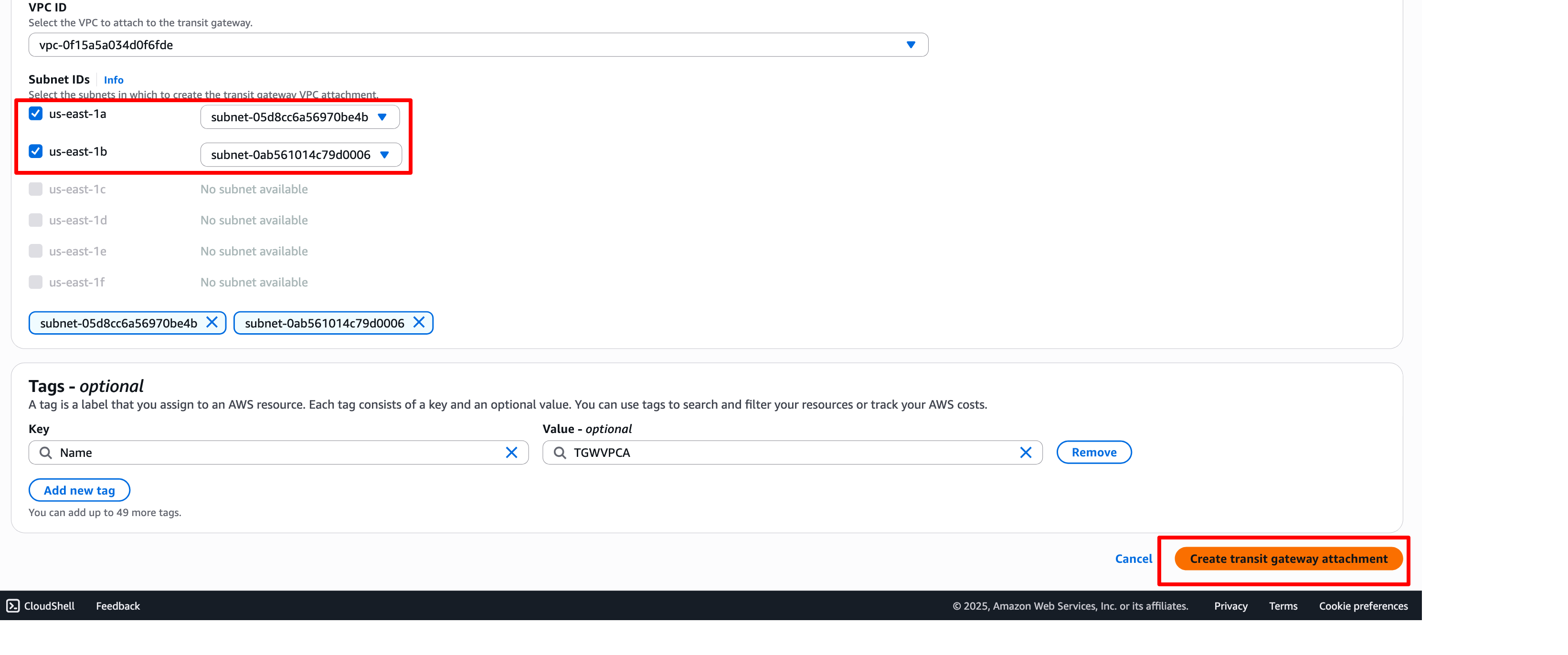 输入 Name tag,选择 Transit Gateway ID 名称(Workshop-TGW)并选择 VPC IDVPC-A。选择所有可用区和子网,点击 Create transit gateway attachment