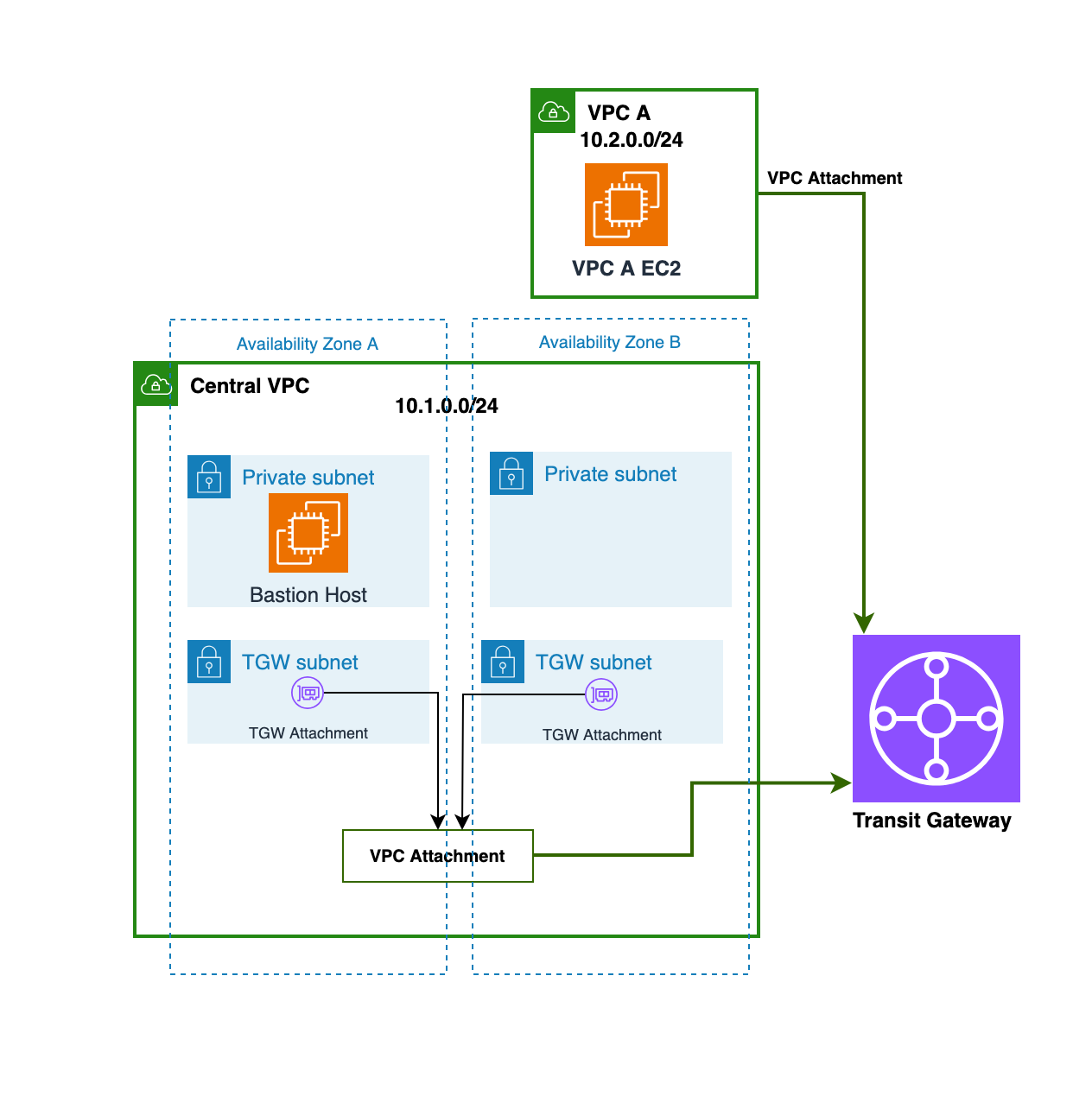 已经看到一个用于Central VPC的TGW attachment,创建的新attachment是用于将VPC A连接到Transit Gateway。