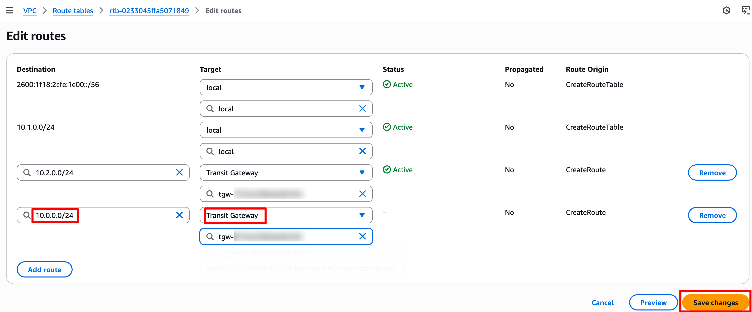 1. 在 Central VPC 私有路由表中,使用 Transit Gateway(TGW Central VPC Attachment)作为目标,添加到本地 LAN 10.0.0.0/24 的路由。