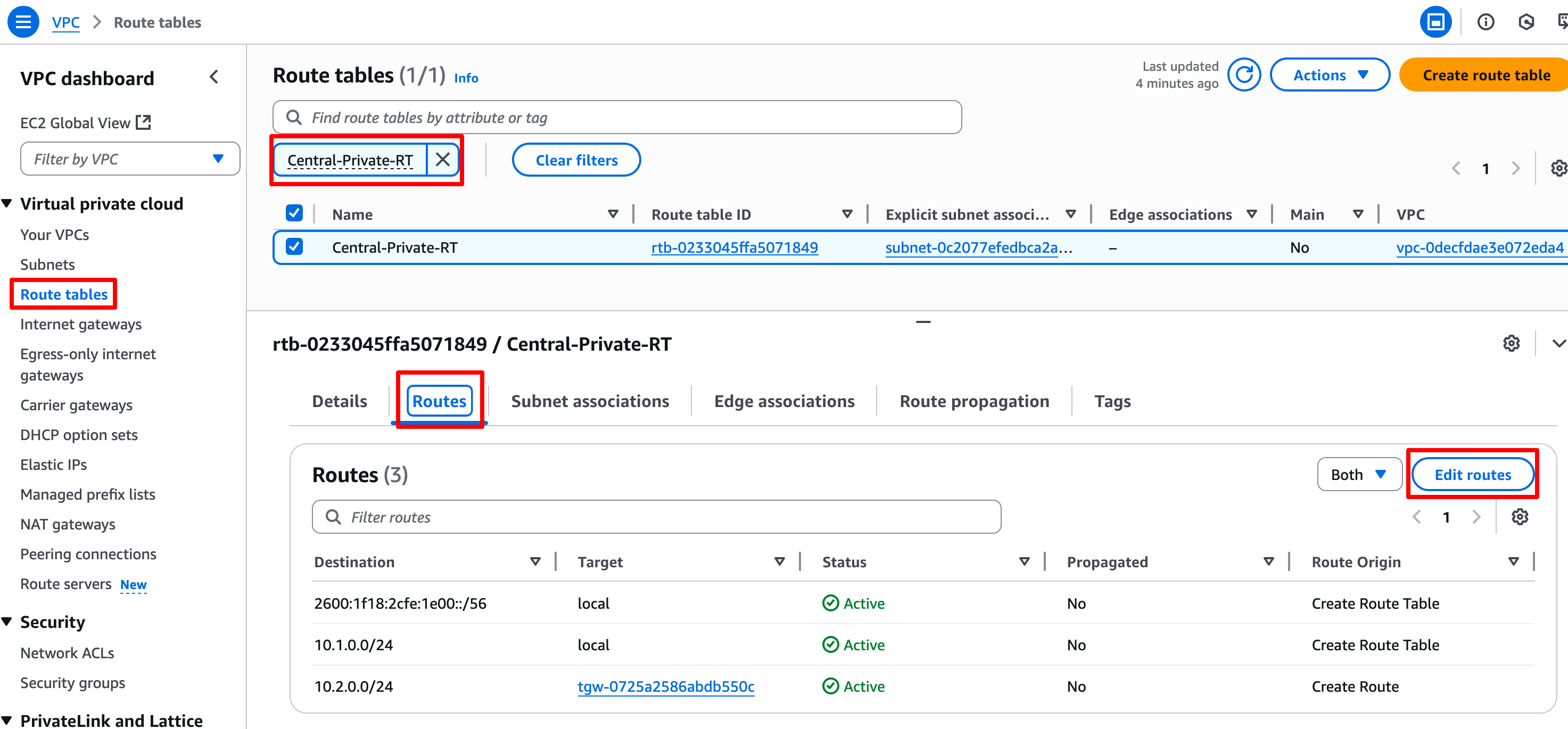 2. 选中 Central-Private-RT 路由表的复选框,向下滚动选择 Routes 选项卡,然后点击 Edit routes