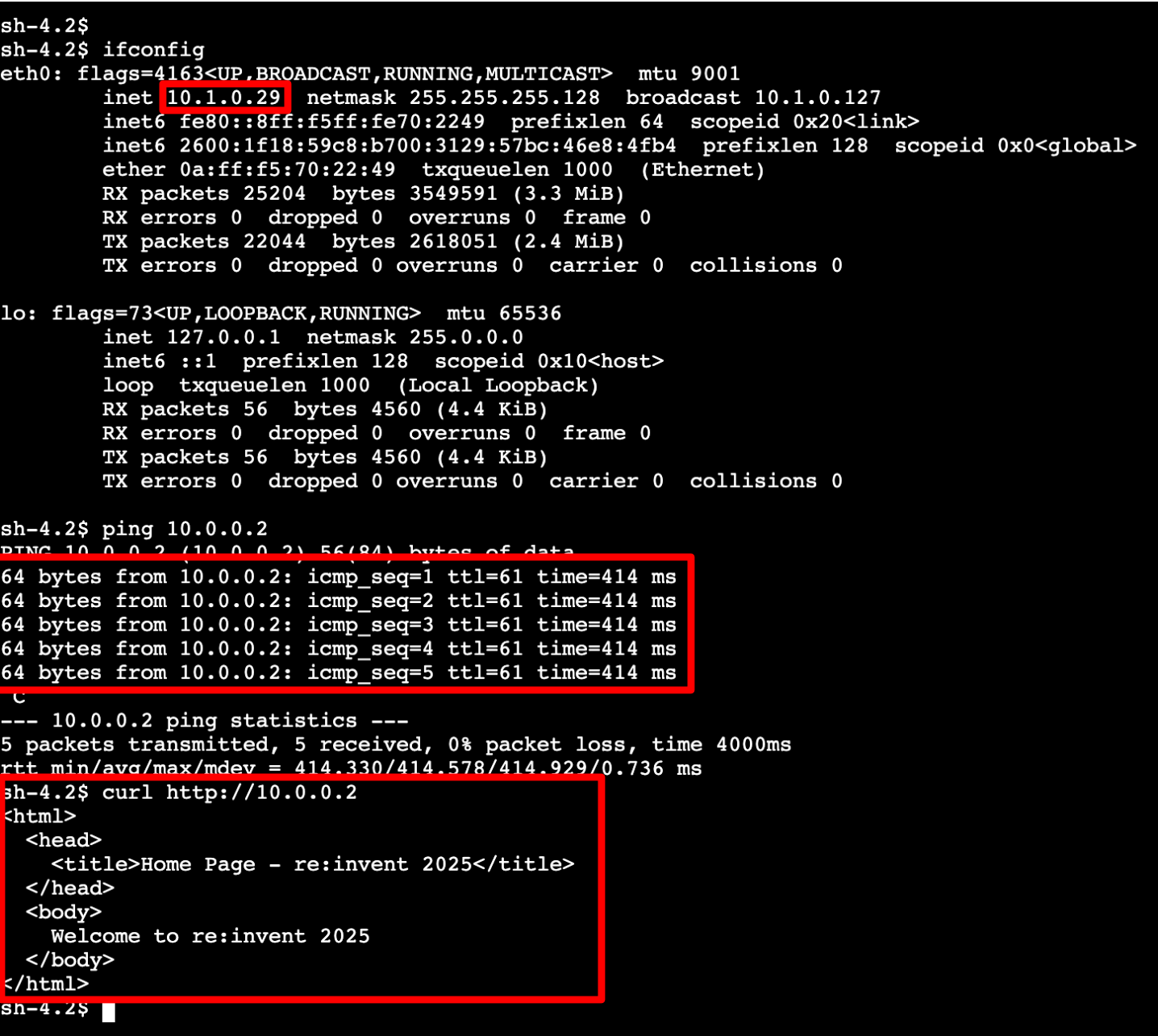 1. 会话打开后,执行 ping 10.0.0.2curl http://10.0.0.2 以确认通过 Direct Connect 的连通性正常工作。