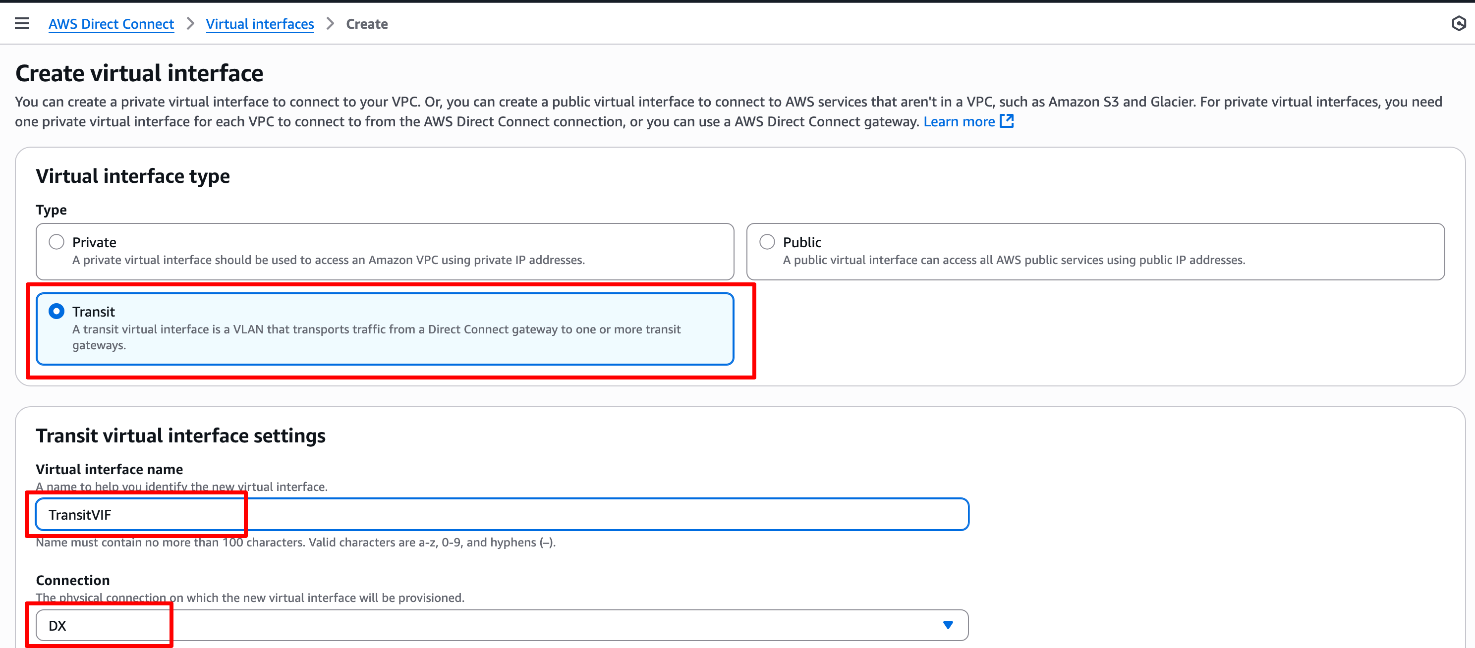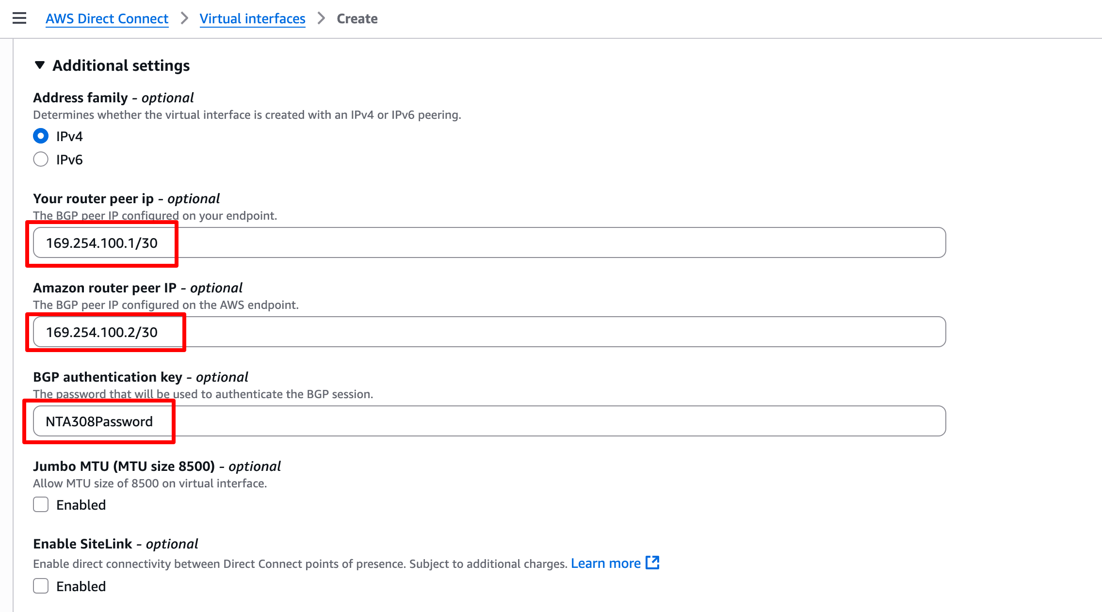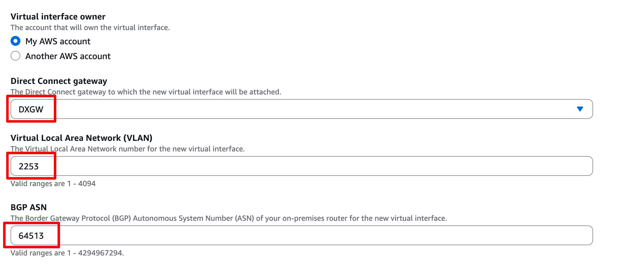 • BGP ASN:64513(或选择我们自己的,但必须与 DX Gateway 上指定的 ASN 不同)