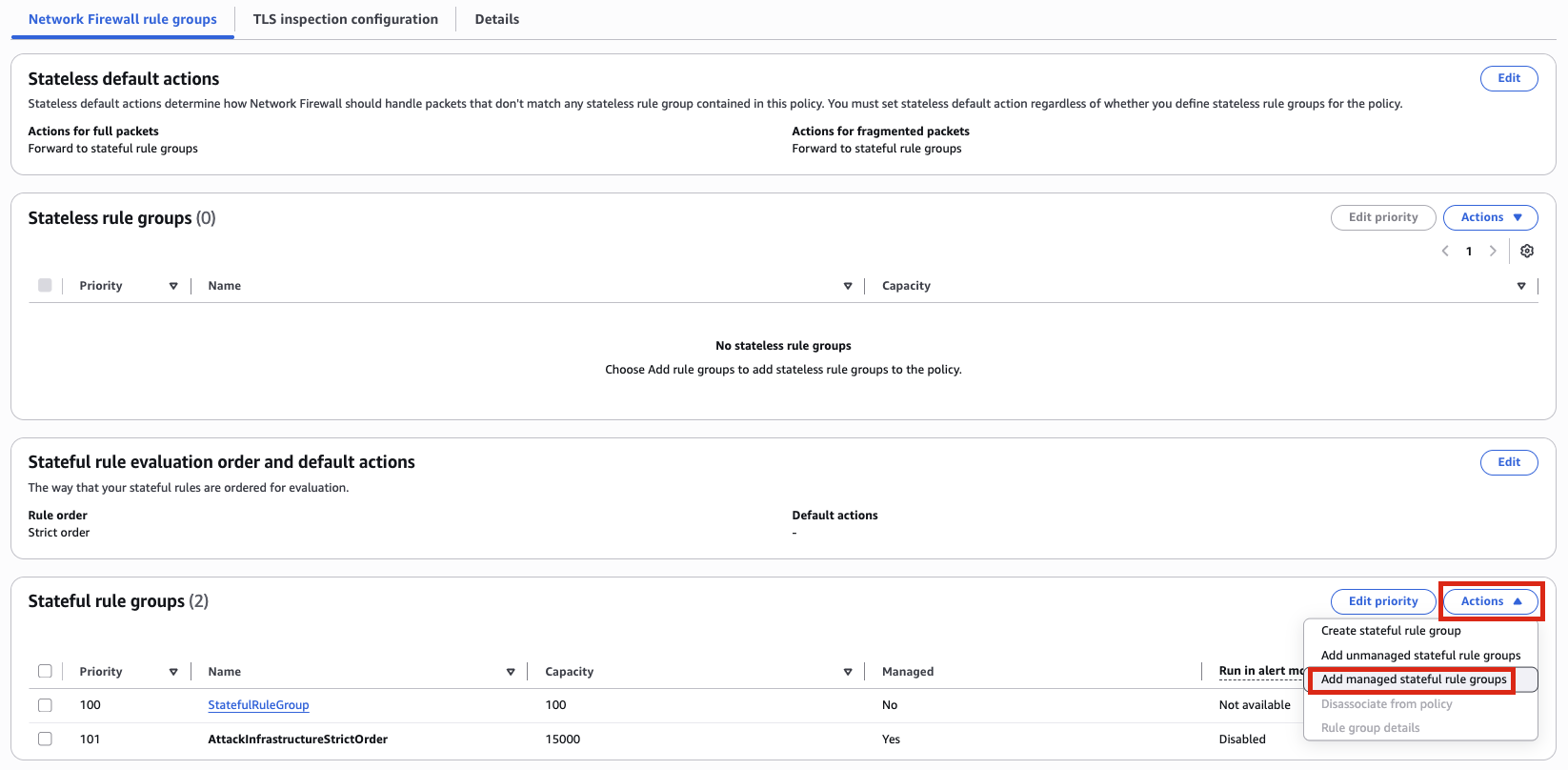 AWS Network Firewall 提供 AWS managed rule groups ,提供由 AWS 维护的预配置、持续更新的安全规则。这些规则组帮助保护我们的网络,无需我们自己编写和维护复杂的防火墙规则。
