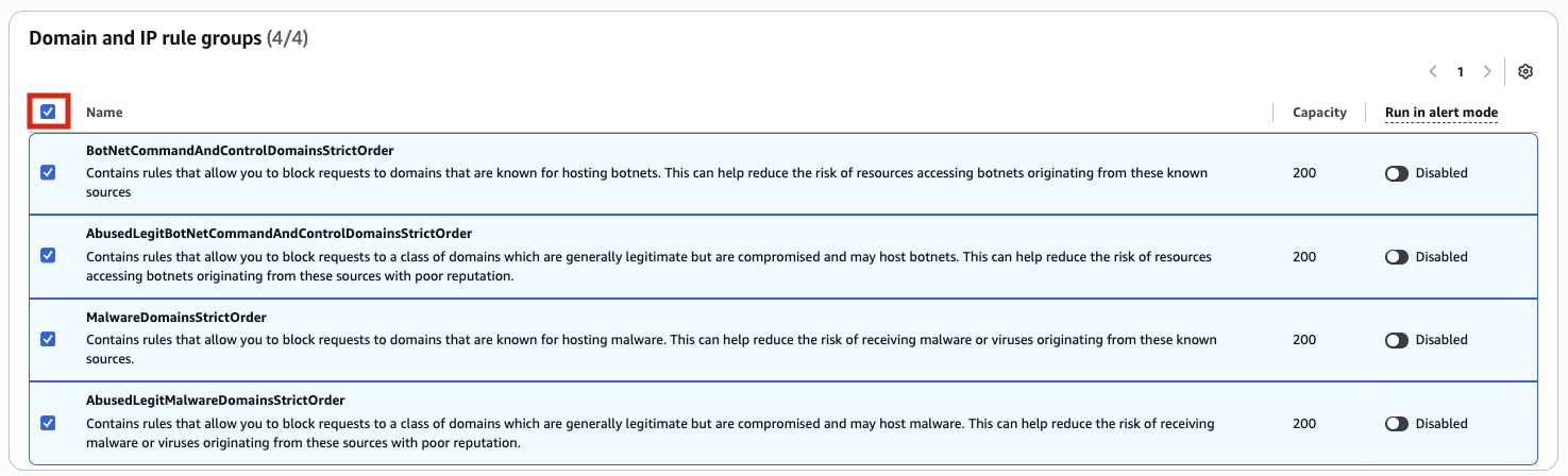 最佳实践是启用所有域名和 IP 列表规则组 ,以最大限度地防御已知恶意目标。