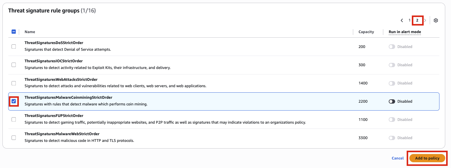 有关 AWS 威胁签名规则组的更多信息,请参阅 AWS Network Firewall 文档 。