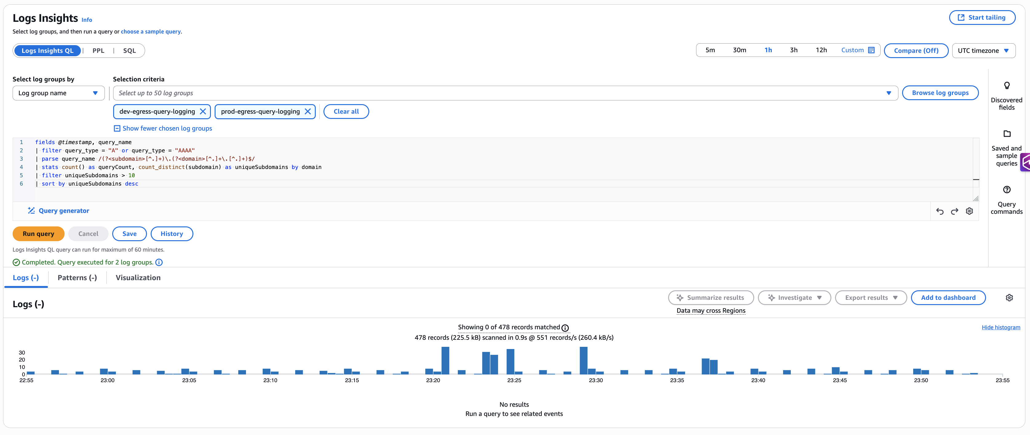 导航到 CloudWatch 控制台,选择 Logs > Logs Insights,并同时选择两个 Route 53 Resolver 查询日志组(dev-egress-query-logging 和 prod-egress-query-logging)。